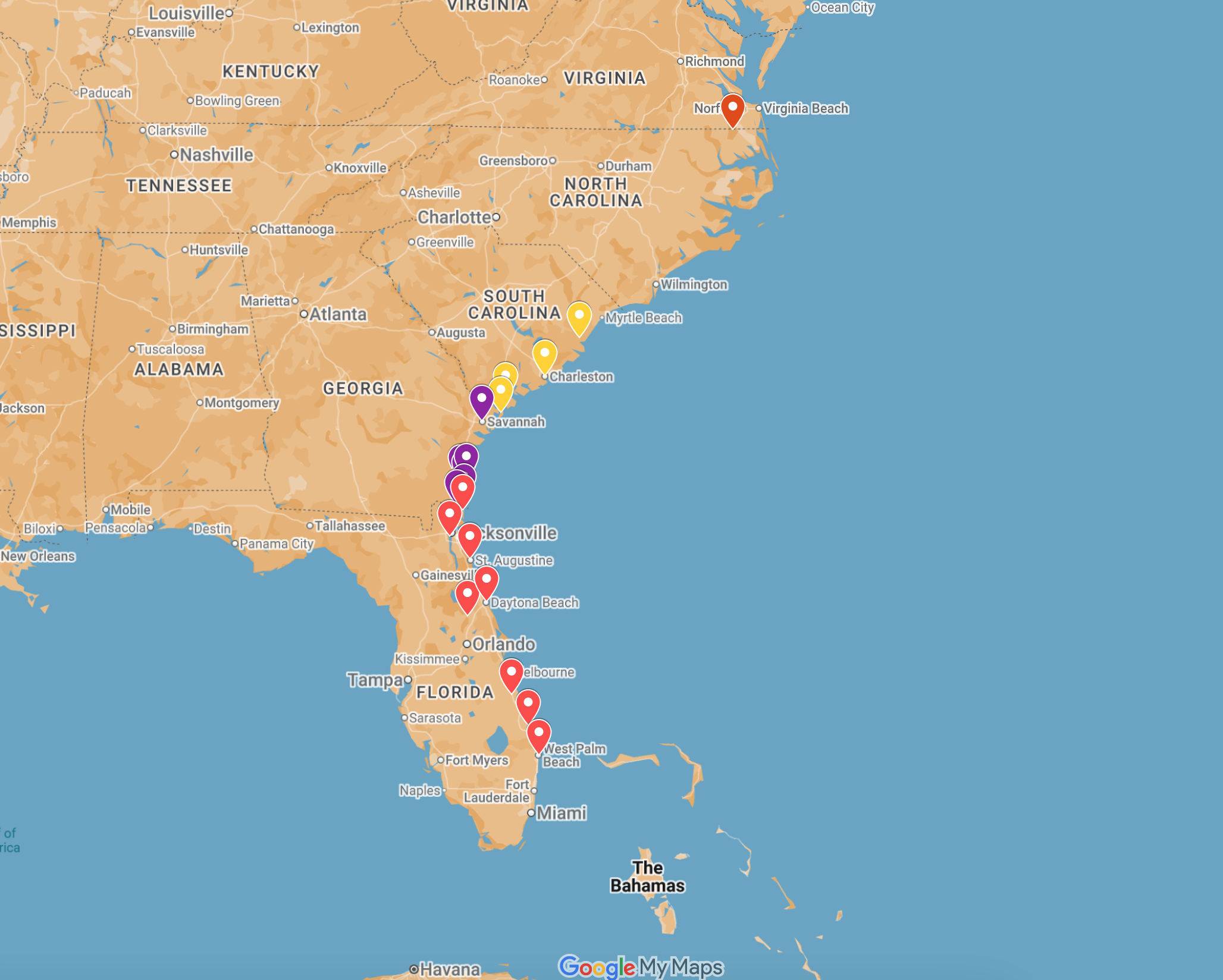 Florida: Fernandina Beach, Ortega (Jacksonville), St. John’s River, St. Augustine, Daytona Beach, Stuart, Indian River, West Palm Beach