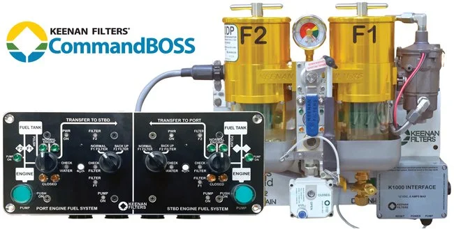 Keenan Filters, manufacturer of the popular FilterBOSS fuel management systems, has just introduced their most advanced catamaran system ever. The new CommandBOSS features an industry first full function control panel that remotely monitors and controls all fuel system functions from the helm. This allows the operator to keep safely running without stopping motors and going into the engine compartment to address problems.