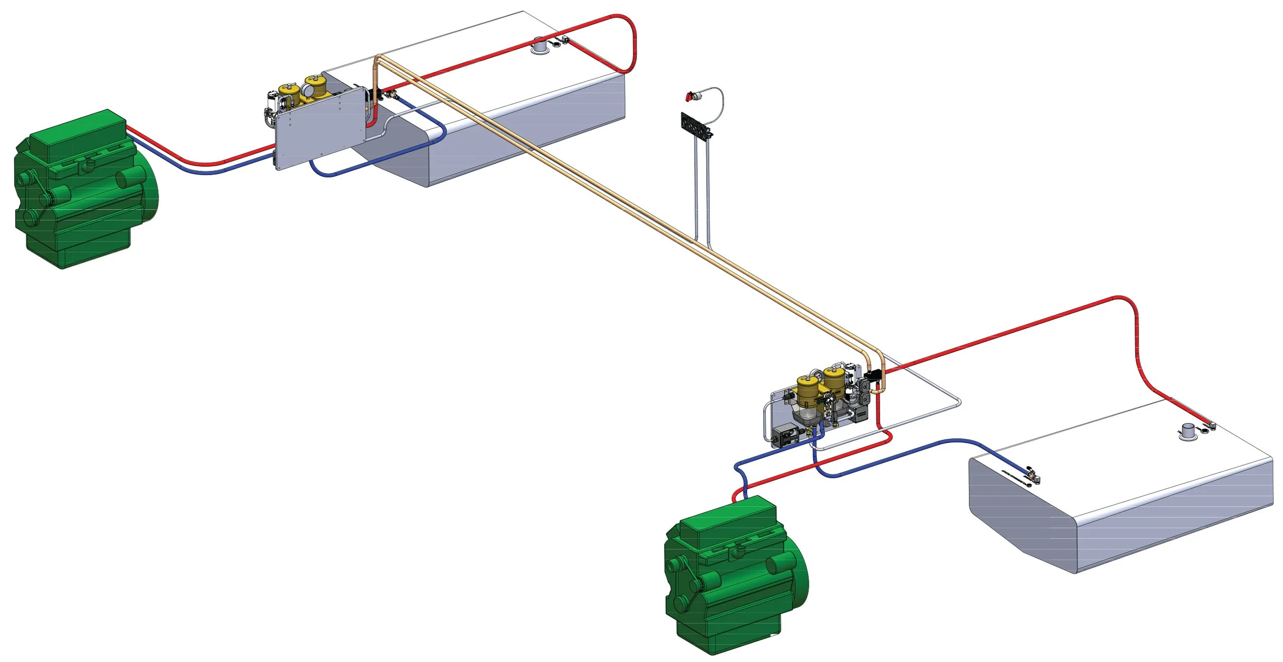 Designed to offer ultimate control of two engine systems like catamarans, the CommandBOSS can be manufacturer installed or retrofitted into most models. Prewired for plug and play installation, the system includes two board mounted port and starboard MK60DP Dual filter systems with electrically controlled manifolds, interface box, K1000 control panel and two 45 foot interface cables. Installation requires the appropriate filter system be installed in each engine compartment, as well as two fuel transfer fuel lines between hulls and fuel line connections between each fuel tank and the engine fuel lines.